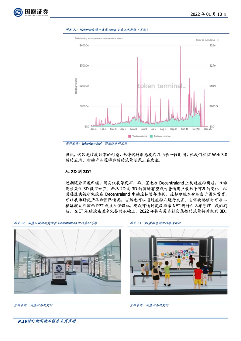 新的流量范式。Web3.0 将不是单纯争夺用户注意力和资金流入口,由于协议的复合型、用户登录的开放性等特点,协议的调用次数往往更重要。同时,Sandbox、Roblox、我的世界的兴起,让市场看到了从 2D 到 3D 的升维,除了更立体的展示效果,还会有更多的社交空间。