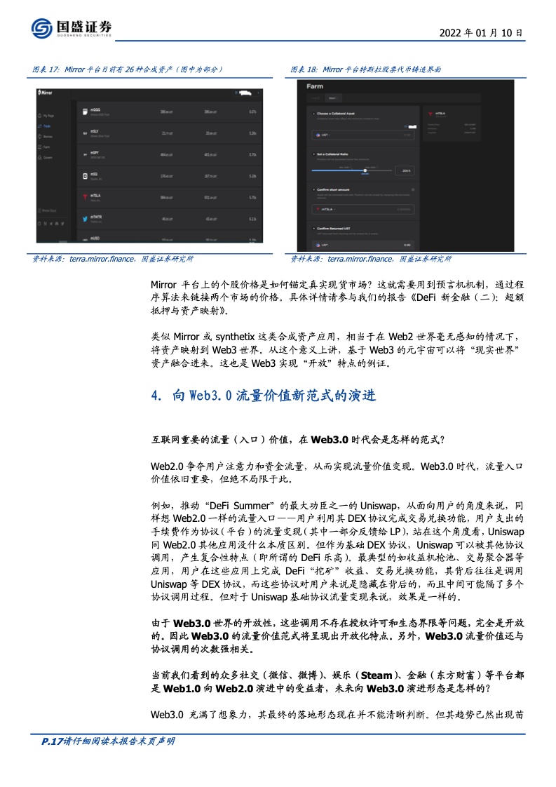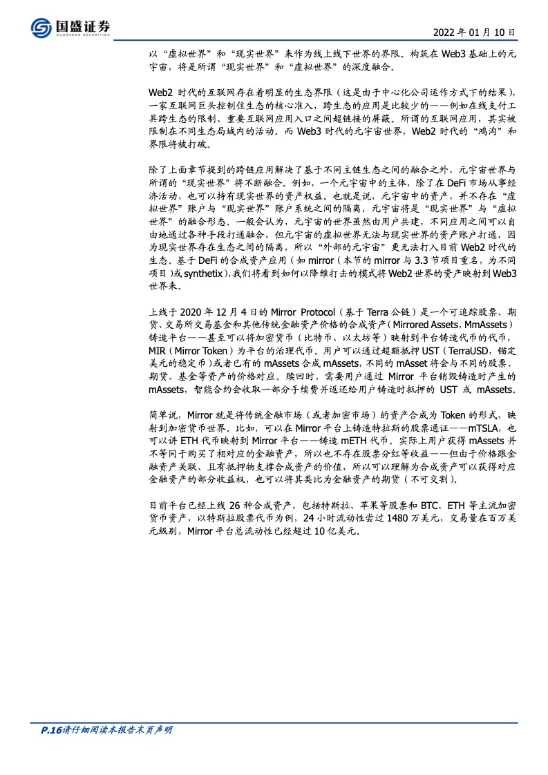 2)用户行为不受第三方限制、互联网应用打破原有的所谓生态内、生态间的界限,应用之间具有高度的组合性和复合性;合成资产、NFT 等组合下,甚至可以在非许可、无交割的前提下将传统世界财富融合进入 Web3.0。