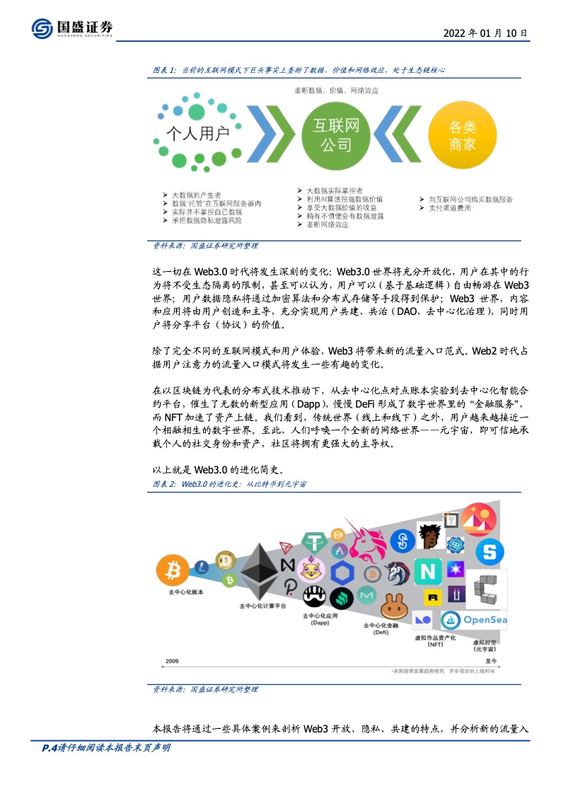 Web2.0 时代,以互联网巨头为核心,形成多个生态圈,核心互联网公司对数据、价值和网络效应具有垄断性,生态之间存在着强大的隔阂界限。互联网世界最重要争夺的资源便是流量入口(用户注意力和资金流)。这一切在 Web3.0 时代将发生深刻的变化:Web3.0 世界将充分开放化,用户在其中的行为将不受生态隔离的限制,甚至可以认为,用户可以(基于基础逻辑)自由畅游在 Web3 世界;用户数据隐私将通过加密算法和分布式存储等手段得到充分保护;Web3 世界,内容和应用将由用户创造和主导,充分实现用户共建、共治,共享平台的价值。