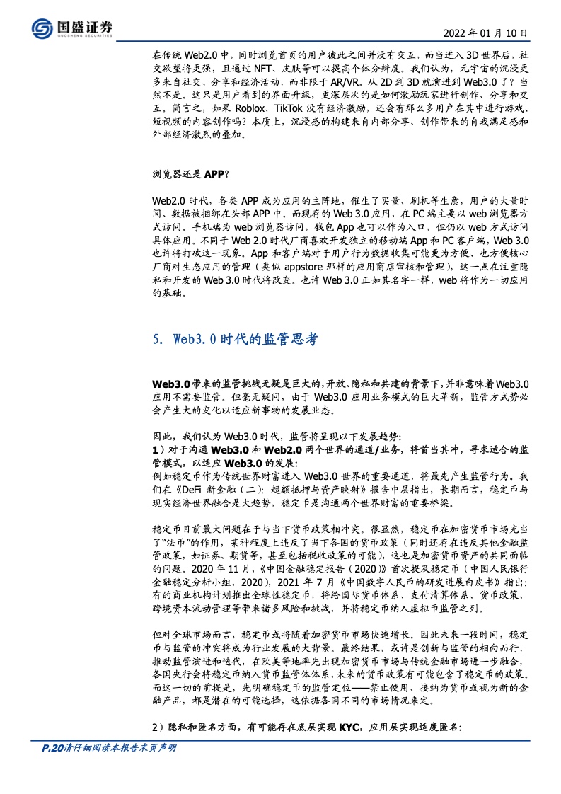 另外,本文对 Web 3.0 时代的监管也做了一些探讨和设想。1)稳定币——首当其冲,纳入传统监管框架;2)隐私性——底层 KYC,应用层实现可控适度匿名;3)DAO 治理——探讨阶段,传统监管介入。