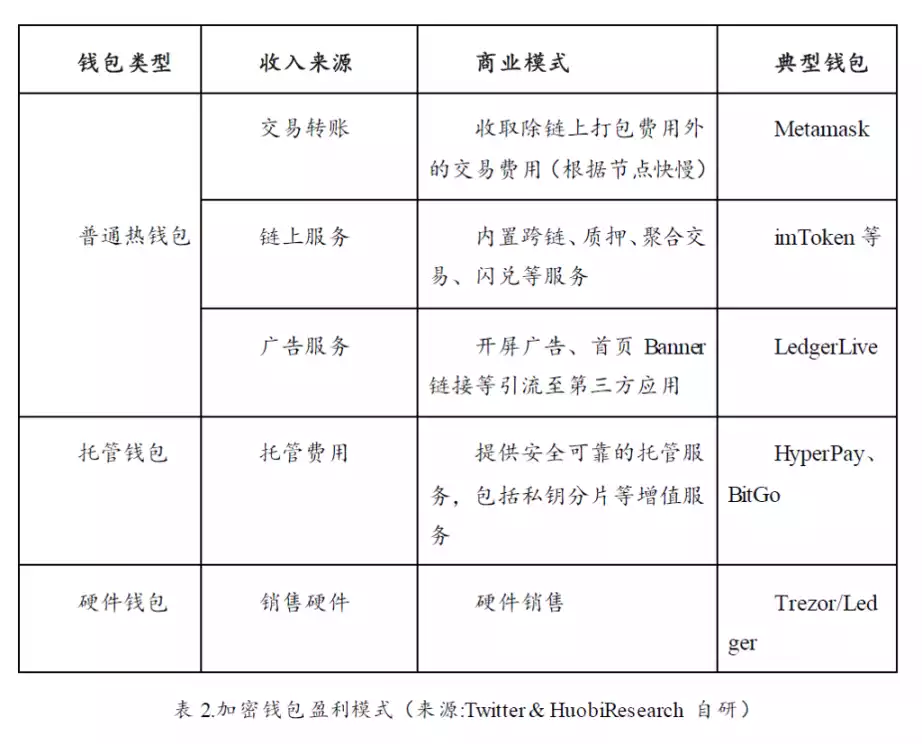 目前,市场中的加密钱包从普通热钱包、托管钱包和硬件钱包来看,我们调研统计了市面上的大多数钱包,其收入来源和商业模式分析如下: