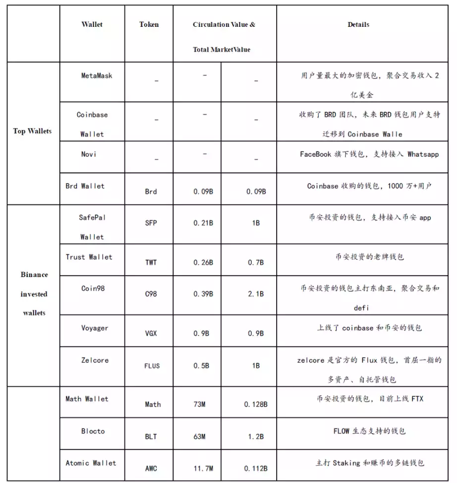 从公开的资料来看,目前头部钱包几乎被大公司所占驻,要么是直接开发作为其产品,要么是入股投资。下表中我们将目前市场上常用的钱包作了分类,一类是头部巨头公司直接开发的钱包如 Metamask、Coinbase 钱包、Facebook 推出的钱包,另一类则是币安投资的钱包如我们常用的 Trust Wallet、C98 等。最后一类是新晋的增长较快的钱包。在第四列和五列中给出了其流通市值和总市值。详细描述如下表所示: