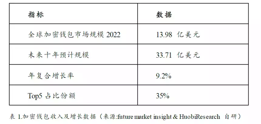 从收入规模上来看,根据 future market insight 的研究指出,2022 年全球加密钱包市场总收入约为 13.98 亿美元,预计未来十年内将突破 33.71 亿美元,年复合增长率达 9.2%,将呈现高速增长态势。当然头部钱包会越来越强,将会占到整个市场份额的 35% 左右。