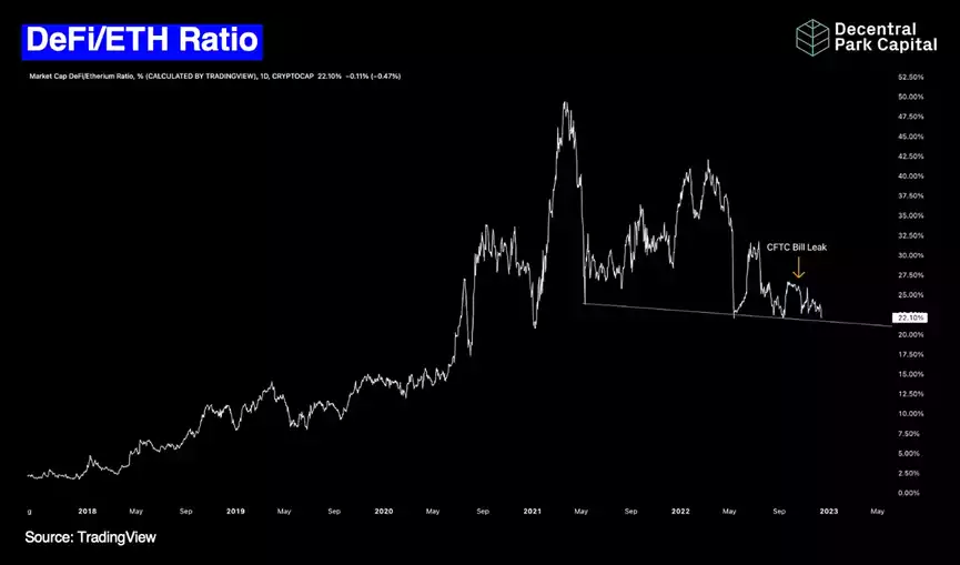 内容:DeFi 市值 /ETH 的市值比率在 2022 年创下了更低的高点和更低的低点。