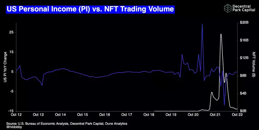 内容:美国个人收入同比变化率与全球 NFT 交易量。