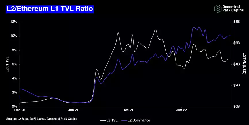 我们将何去何从?L2/L1 TVL 比率在 2023 年攀升至历史新高(> 15%),这是由于 L1 的 gas 成本可能较低,但人们仍希望在更可扩展的基础上进行交易 ( 整个 2022 年的多个时期都是如此 )。