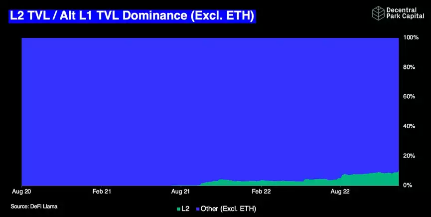 内容:L2 总价值锁定与替代 L1(Alt L1)的主导地位在 2022 年从 3% 增长到 10%。