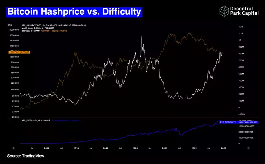 内容:比特币不断上涨的哈希价格(哈希率 / 价格)与受抑制的 BTC/USD 比率以及不断攀升的挖矿难度。