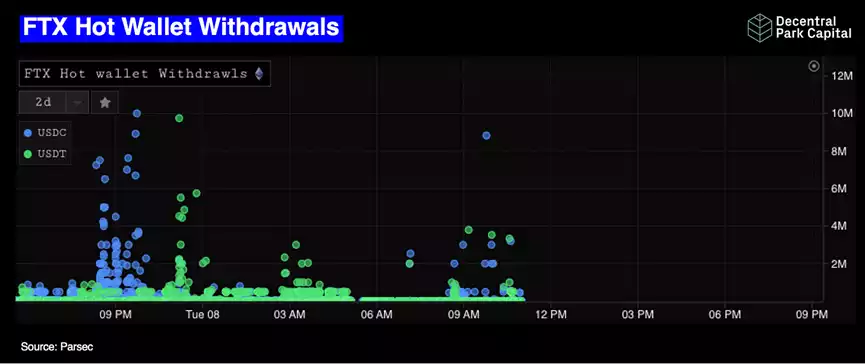 内容:2022 年 11 月 7 日至 8 日从 FTX 交易平台热钱包中提取 USDC 和 USDT 的散点图。