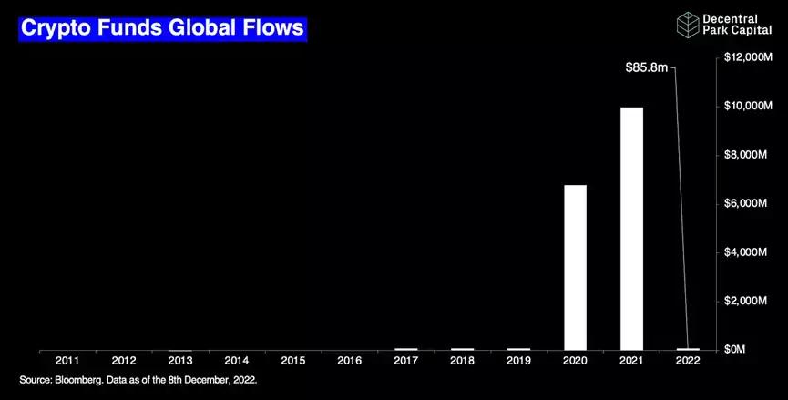 内容:自 2011 年以来,全球流入加密货币基金的资金总额。总资金流量为 8580 万美元(截至 12 月 8 日)——比 2021 年的总流量下降了 99%。