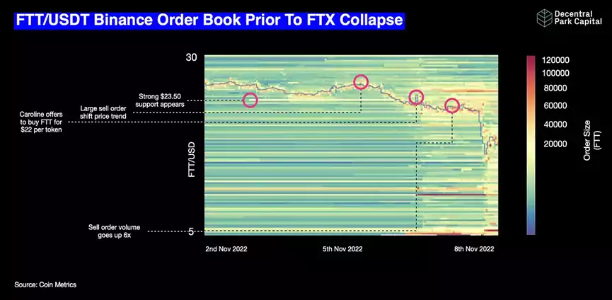 定义原因:它提供了链上证据(以链下数据为背景),表明至少有一个市场参与者希望支持 FTT (FTX 交易平台的原生加密资产 ) 的价格。在 Caroline (Alameda 首席执行官 ) 提出以 22 美元 / 单位的价格购买 FTT 之前,强劲的支撑在 23.50 美元。这是一堆该死的证据——你不会公开告诉别人一个价格水平,除非你非常有信心你需要这个价格。