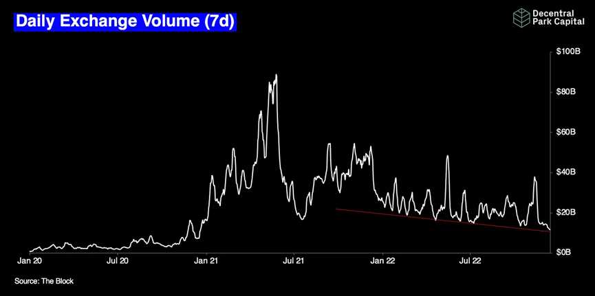 内容:自 2020 年 1 月以来,加密货币交易平台所的全球每日交易量(美元)。这一重要指标一直是衡量市场利率和流动性的良好代理指标。交易量的低谷与情绪的低谷同时出现。
