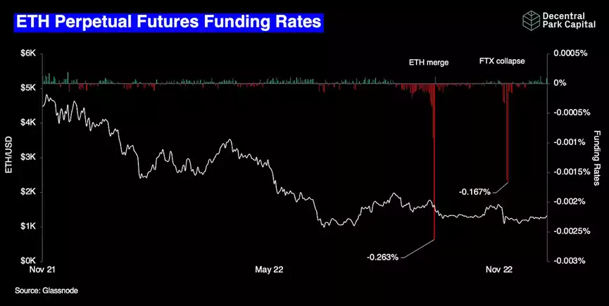 什么:总融资利率与 ETH/USD 的对比。ETH 永续市场在 2022 年有两个不同的时期经历了最负的融资利率时期。