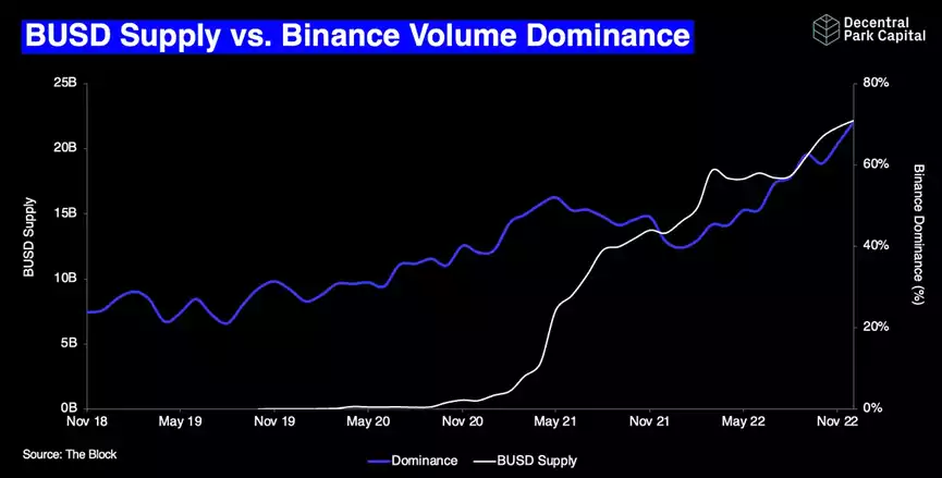 内容:币安的 BUSD 供应量增长到 222 亿的历史新高,而币安交易量优势上升到 60% 以上的历史新高。
