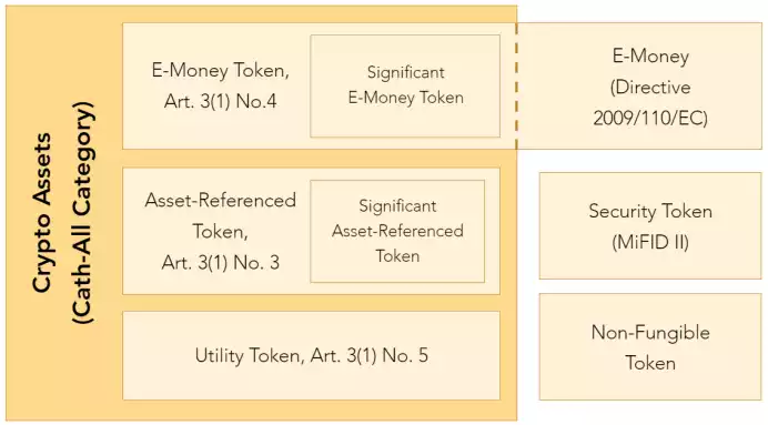 MiCA 为加密资产作出了一个广泛的定义,即一种价值或权利的数字表示,可以使用 DLT 或类似技术以电子方式传输和存储的(Crypto-assets are defined in MiCA as a digital representation of a value or a right that may be transferred and stored electronically using DLT or similar technology)。根据加密资产是否需要锚定其他资产的价值,MiCA 将加密资产分类成了电子货币代币(Electronic-Money Tokens,EMTs)、资产参考代币(Asset-Reference Tokens,ARTs)和其他加密资产。