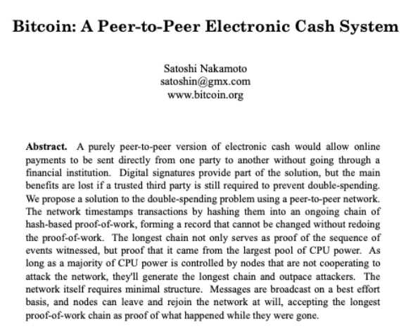 20082008 年 11 月,中本聪发表了论文《比特币:一种点对点的电子现金系统》
