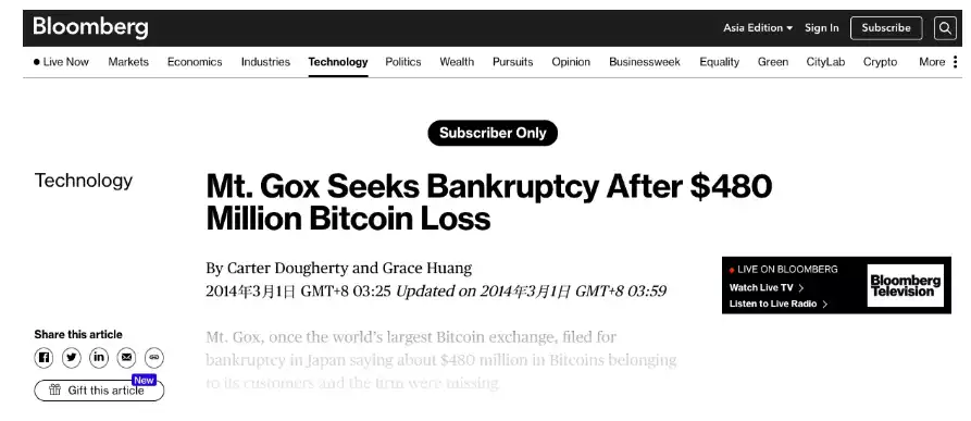 2014 年 2 月,Mt.Gox(一家日本的比特币交易所,谐音梗也被称为门头沟交易所)因被黑客盗取比特币而关停破产,公司称其损失了接近 75 万属于客户的比特币以及约 10 万左右属于公司自身的比特币,两者合计约占世界比特币总量的 7%,按当时汇率估计约值 4.73 亿美元。