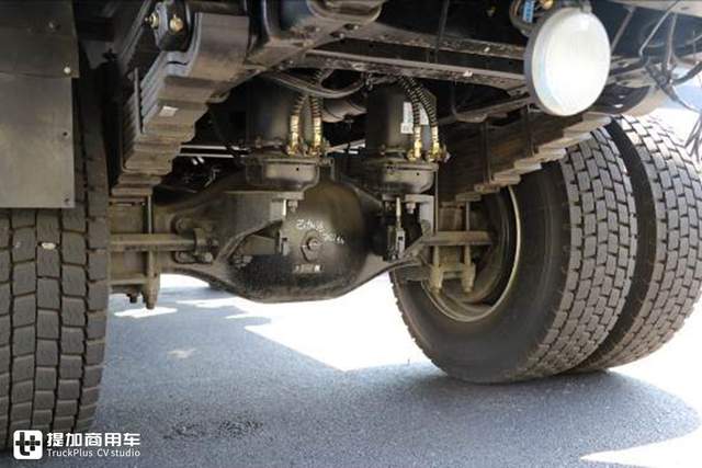 3:承载能力强。得益于这辆车是非公路车型,所以在配置上就没有太大的约束,全车使用了315/70 R22.5的驱动花纹(麻将块)轮胎和多片簧钢板悬架,前桥加厚工字梁转向桥,后桥为轮边减速桥,承载能力一流,单趟运载量增加。