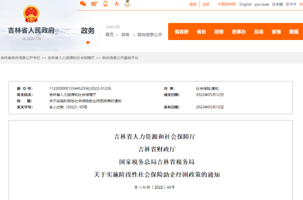 今日,《吉林省人力资源和社会保障厅 吉林省财政厅 国家税务总局吉林省税务局关于实施阶段性社会保险助企纾困政策的通知》(下称《通知》)发布。