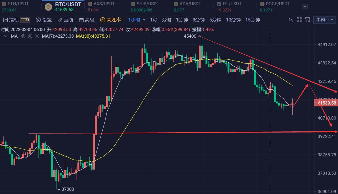 比特币跌破支撑41500一线支撑行情有进一步走弱的风险,趋势走弱那么我们就该考虑进一步开始去布局做空,高点低点目前在不断下移,小时线上面又初步下跌趋势线组成压力,短期内行情交易上面可以重点关注42500一线的反弹位置去做布局,这里不光是下行趋势线压制位,也是前期小时线反抽上去的起跌点,短期内反弹不过这一位置的话下行趋势就是完好的,行情还有进一步下挫的空间走出。操作上面的话,晚间利用行情向42500一线反弹的机会去分批布局空单,止损放43200附近,行情能到43000关口的再补仓一次,目标先看41000附近,第二目标则看40000关口。