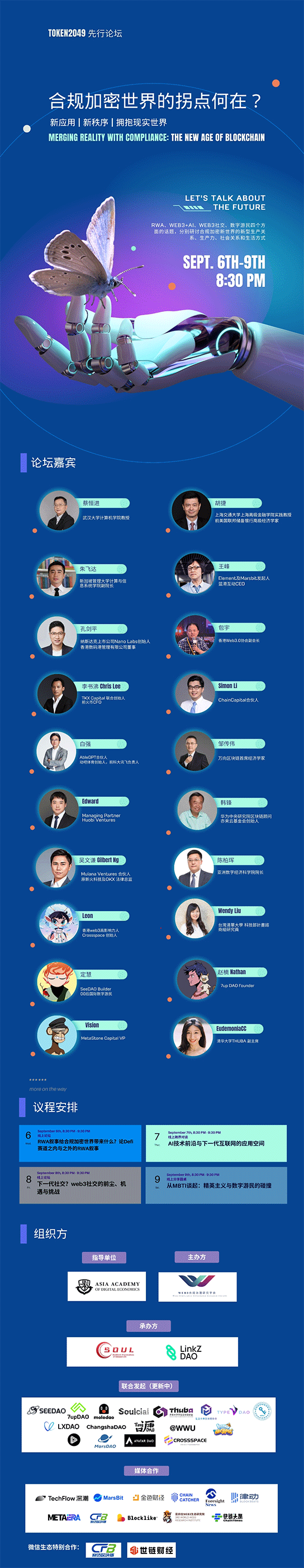 摘要:「合规后 web3 世界拐点何在」系列线上论坛由SOUL X LinkZ DAO 发起,多个知名 Web3 社区联合承办,将于 2023 年 9 月 6 日以线上论坛和圆桌的形式进行。活动将讨论RWA、基础设施和 AI 等话题。与会嘉宾包括香港数码港董事孔剑平、Element 创始人王峰、香港政府