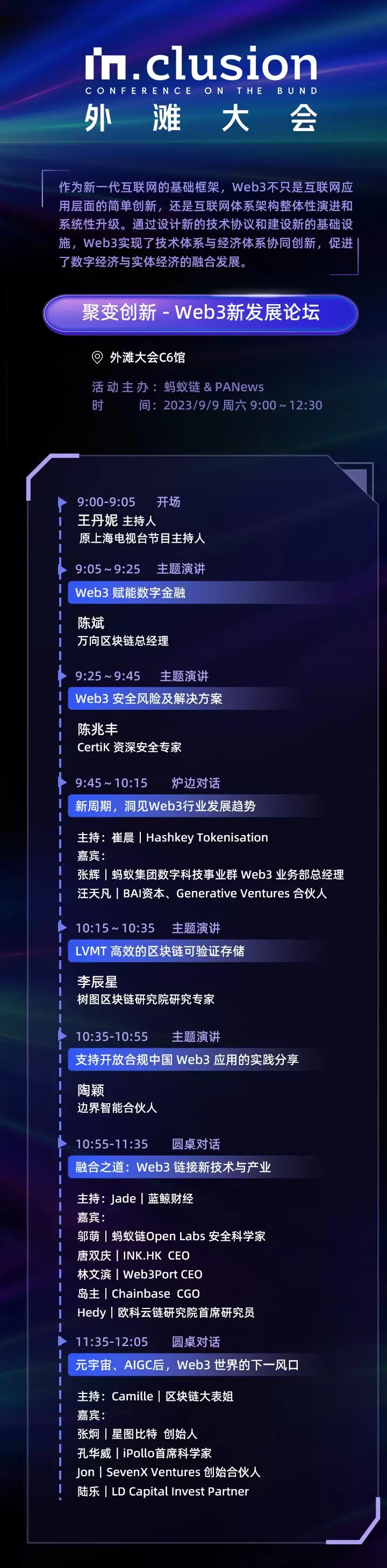 2023年9月9日,即在金融科技盛会“INCLUSION·外滩大会”的第三日,由蚂蚁链和联合主办的“外滩大会:聚变创新·Web3新发展论坛”将于上午9点在沪召开。
