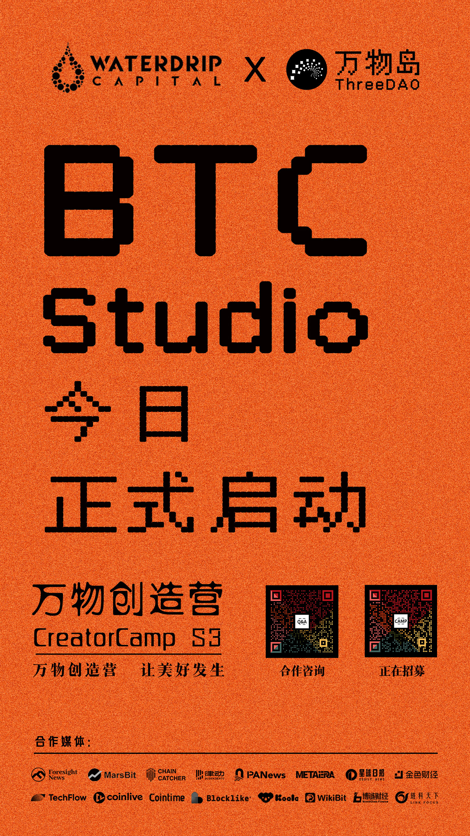 为助力华语创业者快速响应增量市场,水滴资本携手万物岛共建「BTC Studio」,全方面支持 BTC 生态建设者和创作者。BTC Studio 今日正式开启招募,所有入围创始人均可获得万物岛与水滴资本提供的为期 6 个月的创业辅导、融资服务及营销资源支持。目前 Coach 首发阵容已确定:水滴资本创始合伙人大山 Jademont 担任「BTC Studio」主理人。