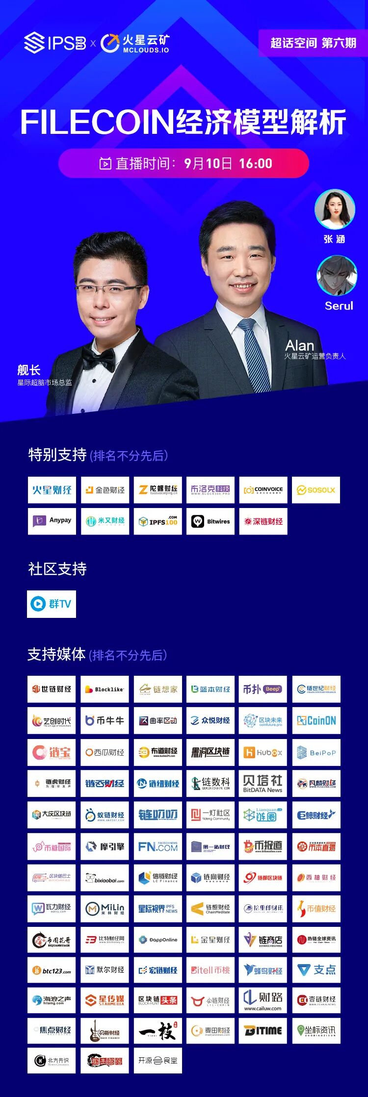 9.10日下午4点,超话空间第六期“Filecoin经济模型解析”线上AMA成功举行,本次访谈邀请到了火星云矿运营负责人Alan,以及星际超脑IPSB市场总监舰长。