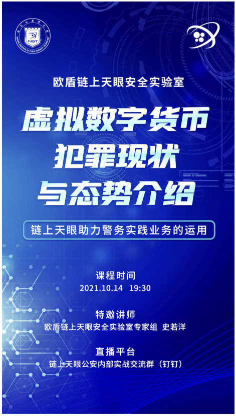 链上资产如何追踪?地址背后实控人如何定位?如何完成区块链相关数据的有效调证工作……10月14日,由欧盾链上天眼安全实验室和智器云联合举办的“虚拟数字货币犯罪现状与态势分析”讲座在线上进行,探索打击虚拟货币犯罪的新方式,助力警务实践业务的运用。来自全国各地公安部门的400余位民警参加培训。欧盾链上天眼安全实验室由南京公安研究院与欧科云链联合成立,双方重点围绕新型犯罪应对、智慧城市建设、社会治理等现实需求,以创新理念推动区块链技术应用与发展,探索区块链技术在公共安全、社会治理等领域的落地应用。