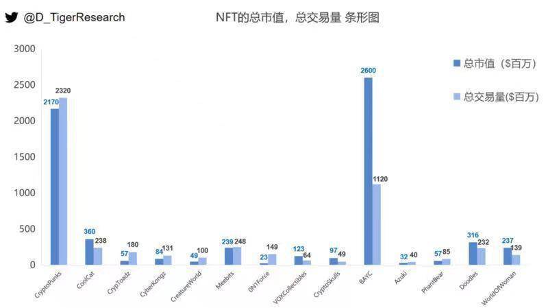 图4-1 15种NFT的总市值和总交易量条形图,截至2022-01-19