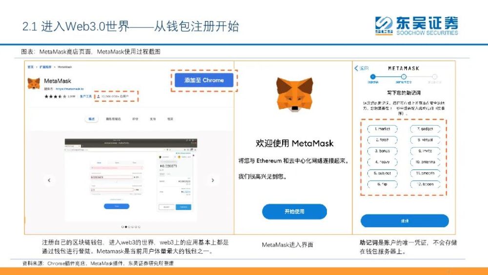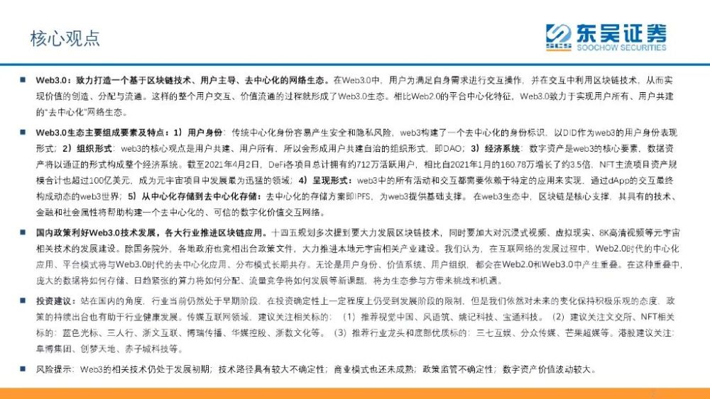 Web3.0生态主要组成要素及特点:1)用户身份:传统中心化身份容易产生安全和隐私风险,web3构建了一个去中心化的身份标识,以DID作为web3的用户身份表现形式;2)组织形式:web3的核心观点是用户共建、用户所有,所以会形成用户共建自治的组织形式,即DAO;3)经济系统:数字资产是web3的核心要素,数据资产将以通证的形式构成整个经济系统。截至2021年4月2日,DeFi各项目总计拥有约712万活跃用户,相比自2021年1月的160.78万增长了约3.5倍,NFT主流项目资产规模合计也超过100亿美元,成为元宇宙项目中发展最为迅猛的领域;4)呈现形式:web3中的所有活动和交互都需要依赖于特定的应用来实现,通过dApp的交互最终构成动态的web3世界;5)从中心化存储到去中心化存储:去中心化的存储方案即IPFS,为web3提供基础支撑。在web3生态中,区块链是核心支撑,其具有的技术、金融和社会属性将帮助构建一个去中心化的、可信的数字化价值交互网络。