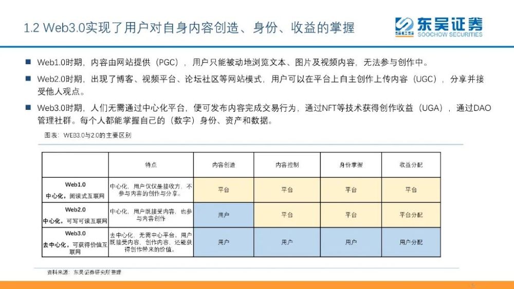 Web3.0:致力打造一个基于区块链技术、用户主导、去中心化的网络生态。在Web3.0中,用户为满足自身需求进行交互操作,并在交互中利用区块链技术,从而实现价值的创造、分配与流通。这样的整个用户交互、价值流通的过程就形成了Web3.0生态。相比Web2.0的平台中心化特征,Web3.0致力于实现用户所有、用户共建的“去中心化”网络生态。