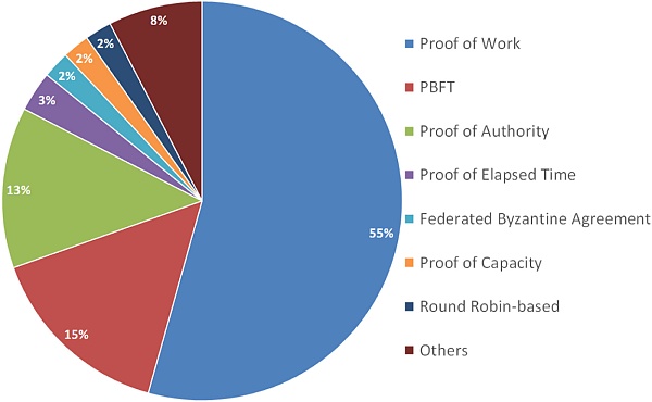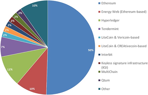 区块链活动也可以根据使用的平台和共识算法进行分类。60% 正在开发基于以太坊的解决方案作为起点,而 55% 使用过 PoW 算法。