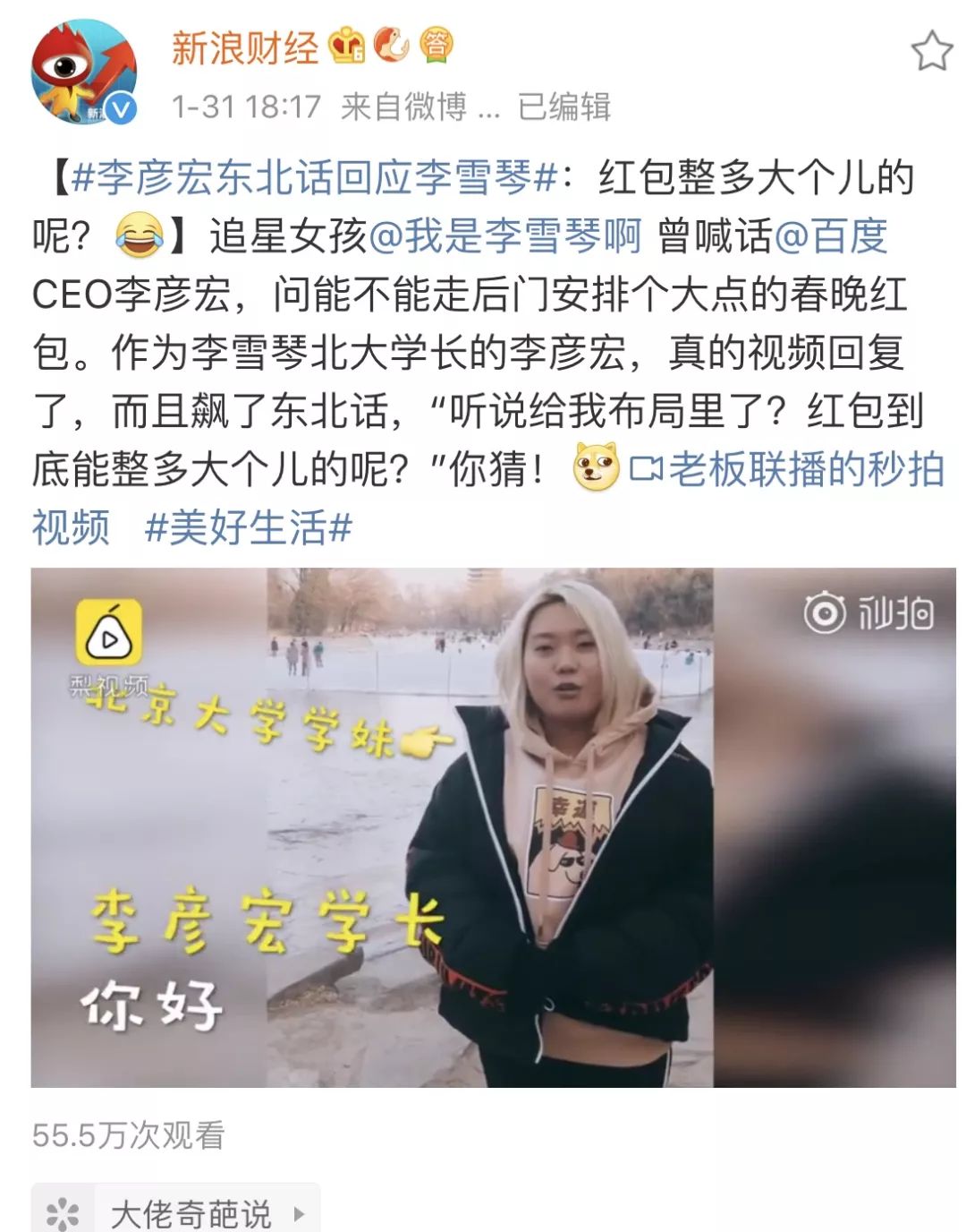1月31日,百度官方微博发了一条视频,视频的主角是李彦宏,他用一口不太标准的东北话在回应追星锦鲤李雪琴的两次喊话:“李雪琴你好,我是李彦宏,听我的员工说你把我布局里了”。