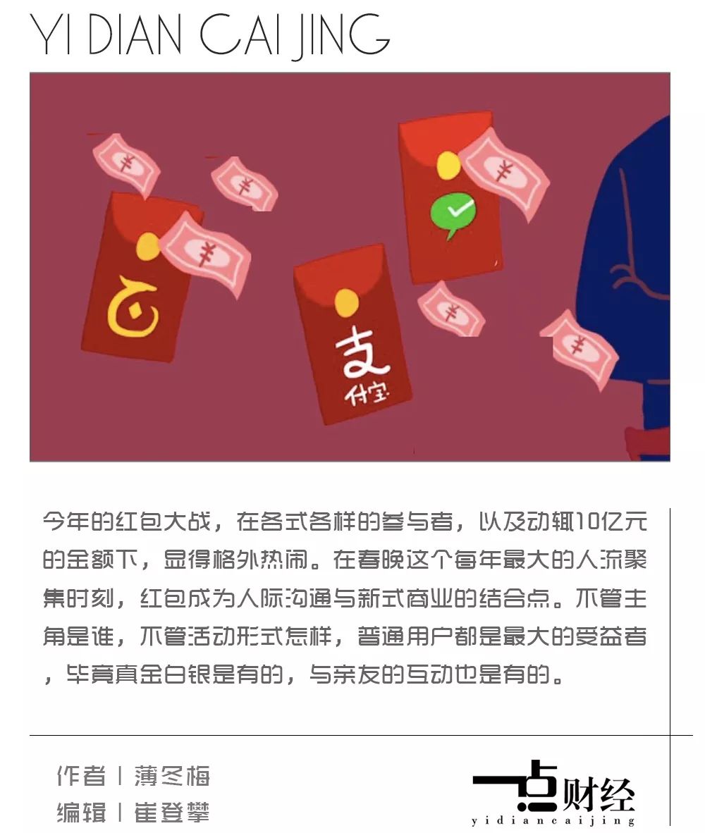 今年的红包大战,在各式各样的参与者,以及动辄10亿元的金额下,显得格外热闹。在春晚这个每年最大的人流聚集时刻,红包成为人际沟通与新式商业的结合点。