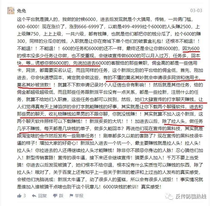 知乎网友兔兔表示,这个平台就是骗人的,主要靠拉人头赚钱,交的钱都被上级、上上级、上上上上级瓜分了。而且交600元任务非常,也不受重视,会继续宣传做6000可以月入过万,任务多,回本快,打字赚钱等等。此外,一些佣金高的任务都是信用卡、网贷之类的,需要实名认证。一些想快速回本又不懂的人,会莫名其妙申请很多网贷和信用卡。