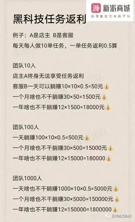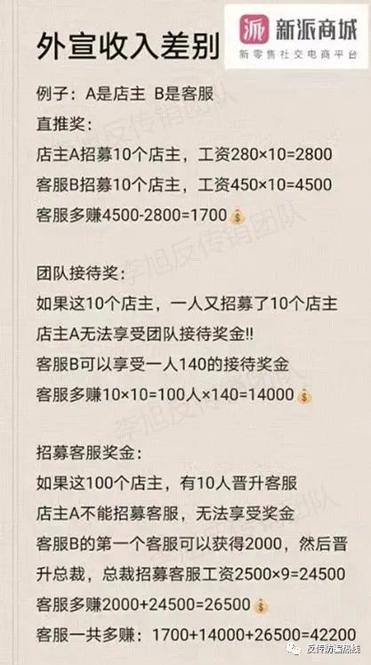 最后李旭反传销团队也提醒大家,像新派商城这样的平台,其本质就是拉人头赚钱,想要靠做任务实现月收入过万那是不肯能实现的。此外,如果将自己的信息泄露在网络或者给陌生人,还会给自己带来很大安全隐患。[此文来源:李旭反传销团队原创文章,如需转载请与我们联系