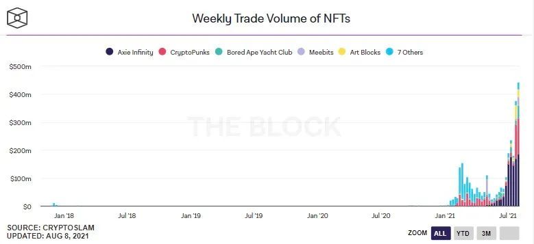 “一般认为,NFT发展经历了几个阶段:2012年至2016年的萌芽期, 2017年至2020年的发展期,2021年至今进入爆发初期。(如果你也想玩NFT,可参见区块链研习社《NFT 最快入门指南,新人快速进阶宝典》)。2021 年 8 月第一周交易额约4.43亿美元,NFT市场交易继续高歌。