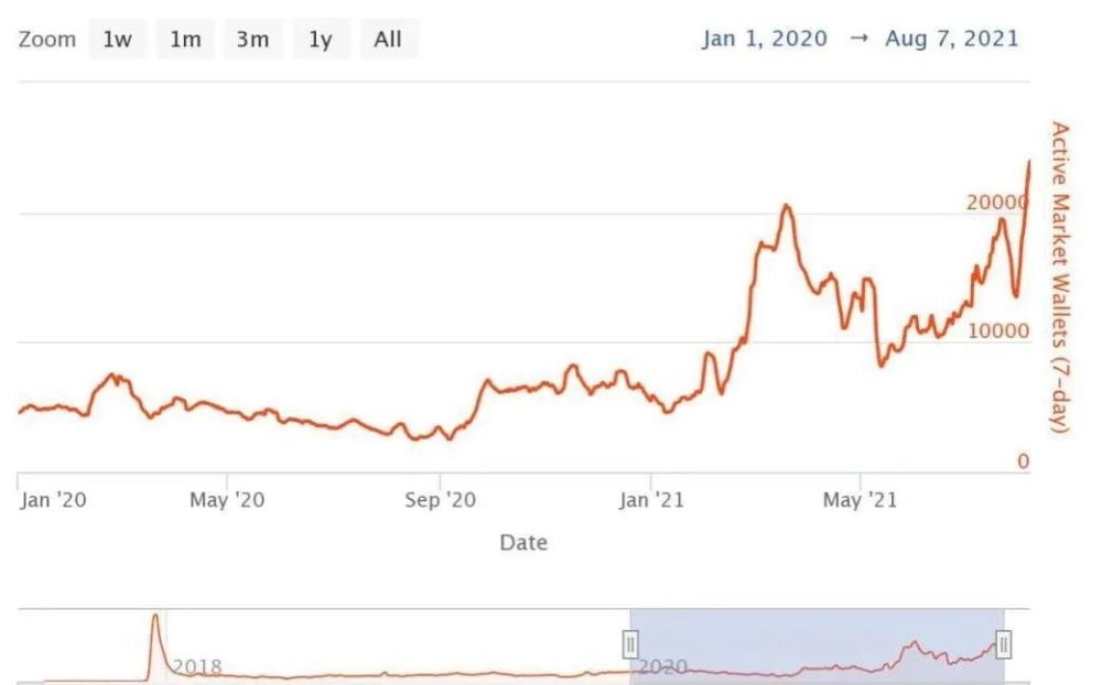 截至 8 月 7 日,每周活跃钱包数变化趋势(图表来源:nonfungible.com)