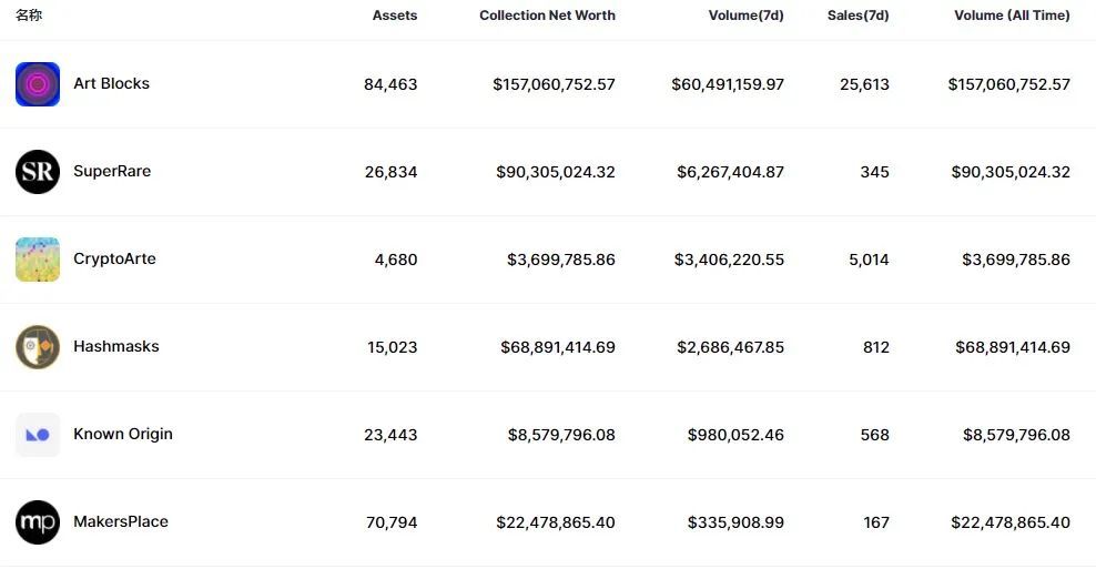 截至 2021 年 8 月 7 日,该领域交易最活跃的项目包括 Art Blocks 和 Super Rare等。其中,Art Blocks 项目7日交易金额超过了 6000 万美元。