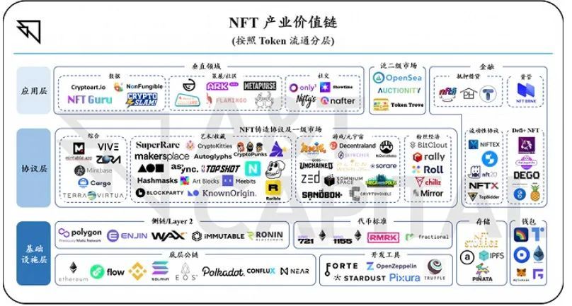 A&T Capital 合伙人与投资经理 Jasmine Zhang 与 Fiona He 按照 NFT 流动性,将NFT 产业价值链整体分成三层,由下至上依次为基础设施层、协议层以及应用层。NFT 生态也更加完善,既有基础设施,也涵盖了各品类的 NFT 产品。