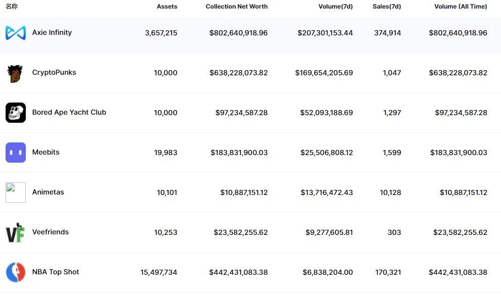 该领域的的佼佼者是 Axie Infinity,截至 8 月 7 日,该项目 7 天的交易金额达到了惊人的 2.07 亿美元。位居第二名的是 CryptoPunks,7 天的交易金额也非常可观,约为 1.7 亿美元。