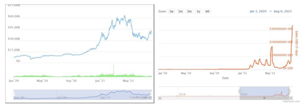 从 2020 年 1 月至 2021 年 8 月 6 日,加密市场整体市值的走势详见如下左图,同期 NFT 市场交易金额的走势如下右图: