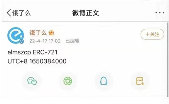 4月17日,饿了么官方微博发文暗示或将于4月20日0时发行ERC-721数字藏品。