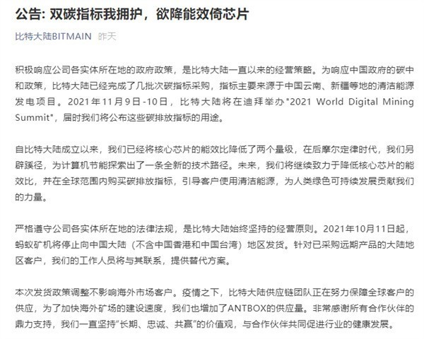 公告指出,比特大陆为响应中国政府的碳中和政策,已经完成了几批次碳指标采购,指标主要来源于中国云南、新疆等地的清洁能源发电项目。比特大陆将于后续公布这些碳排放指标的用途。