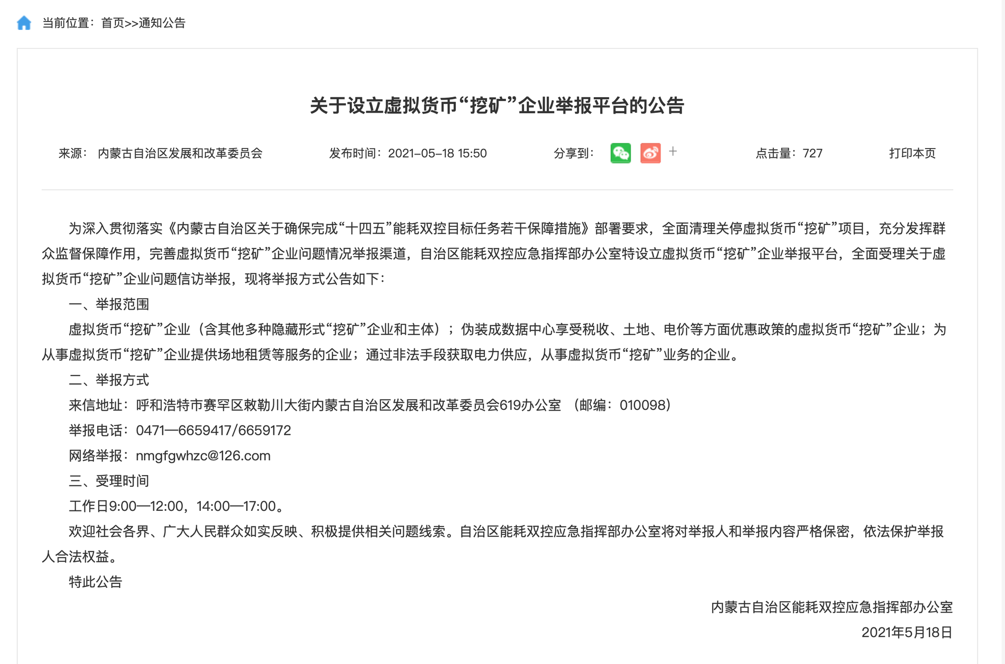 据内蒙古自治区发改委网站5月18日消息,内蒙古自治区能耗双控应急指挥部办公室发布《关于设立虚拟货币“挖矿”企业举报平台的公告》。公告称,为深入贯彻落实《内蒙古自治区关于确保完成“十四五”能耗双控目标任务若干保障措施》部署要求,全面清理关停虚拟货币“挖矿”项目,充分发挥群众监督保障作用,完善虚拟货币“挖矿”企业问题情况举报渠道,自治区能耗双控应急指挥部办公室特设立虚拟货币“挖矿”企业举报平台,全面受理关于虚拟货币“挖矿”企业问题信访举报。