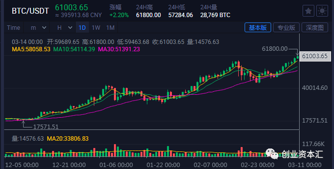 尽管在2月份创下新高后价格有所回落,但比特币又迎来新一波涨势。3月13日晚间,比特币短线迅速拉升,并随后触及6万美元大关。到了3月14日,火币平台上的价格显示,比特币价格继续上涨,一度突破61000美元大关。