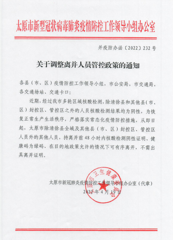 4月19日,太原市新冠肺炎疫情防控工作领导小组办公室发布《关于调整离并人员管控政策的通知》,明确从即日起,太原市除清徐县全域及其他县(市、区)封控区、管控区人员外的其他人员,持离并前48小时内核酸检测阴性证明、健康码为绿码、在目的地政策允许的情况下可有序离开,不需出具离并证明。
