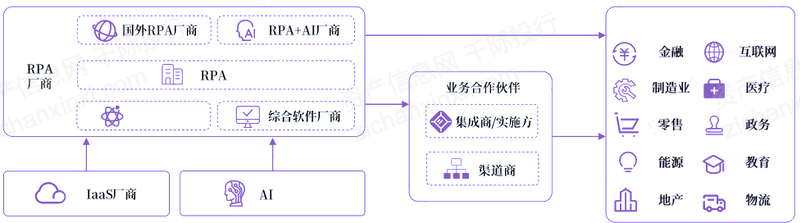 渠道商:帮助RPA厂商扩大市场销售范围。RPA市场仍在发展早期,聚集市场中的业务合作伙伴提升服务能力为不同行业客户提供解决方案是当前市场的主要模式。