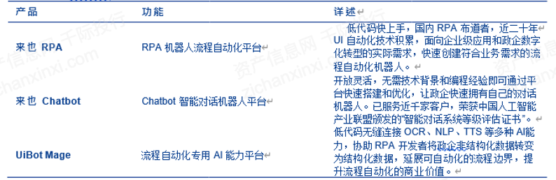 现拥有机器人流程自动化平台“来也UiBot”、智能对话机器人平台“吾来”、全球首个专为RPA机器人打造的AI能力平台“UiBot Mage”三大核心产品,为政企实现“端到端”的智能自动化。
